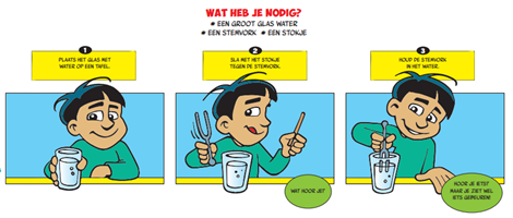 Uitleg: De trilling van de stemvork golft door het water en laat het water spetteren.